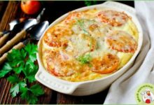 5. Сверху смажем все сметаной, и натрем твердый сыр, чтобы потом образовалась румяная корочка. Добавим в блюдо примерно полстакана чистой воды, и отправляем в раскаленную духовку на 40 минут.