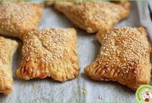 Тесто раскатываем в тонкий пласт и нарезаем на квадратики со сторонами примерно 5 см.