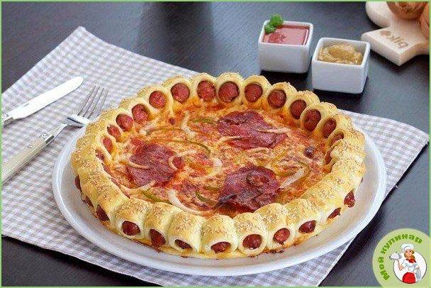 Из сосисок, муки и сыра можно приготовить большую и вкусную пиццу. Сосиски лучше использовать молочные, хотя это — дело вкуса.