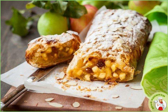 Рецепт приготовления вкусной выпечки с начинкой. Немецкая кухня. Главное — не слишком крупно нарезать яблоки и очень аккуратно руками растянуть тесто от краев.