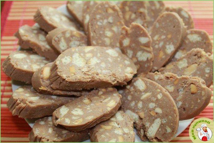 Рецептов шоколадной колбаски из печенья сущесвтует много — с орехами и без, со сгущенкой, с медом и другими подсластителями.