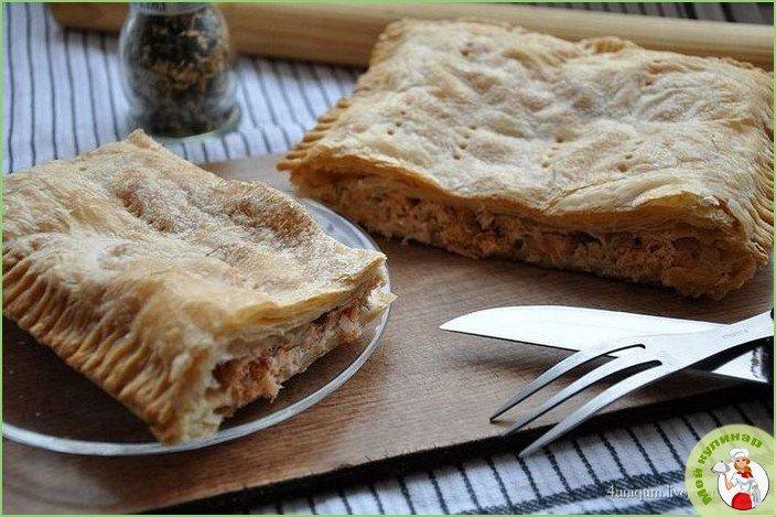 Слоеный пирог с красной рыбой вкусный и сытный! Готовится он достаточно просто, особенно, если купить готовое слоеное тесто.