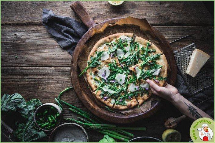 Рецепт приготовления пиццы со спаржей, сыром Моцарелла и сыром Бурсен.