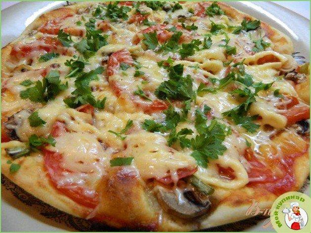 Тесто для пиццы делают разное – дрожжевое и пресное. Этот рецепт с тестом из жареных лепешек. Попробуйте необычный вкус этой пиццы.
