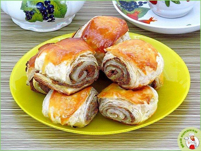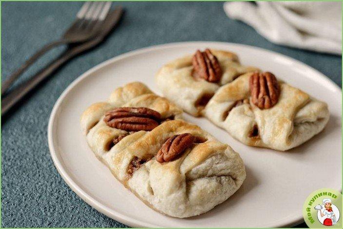 Рецепт булочек из слоеного теста с орехом пекан и кленовым сиропом. Выпечка получается очень ароматной и нарядной, можно подавать на праздничный стол.