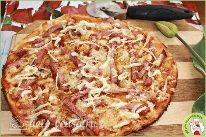 Пицца с вареной колбасой готовится и выпекается в течение получаса. Колбасу можете использовать любую, в том числе вареные сосиски.