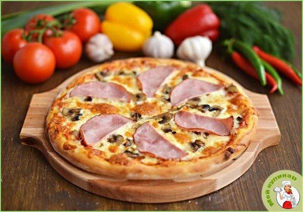 Пицца с ветчиной и шампиньонами — замечательная домашняя закуска «на скорую руку». При наличии заготовки для пиццы процесс приготовления превращается в формальность, справится даже неопытный повар!
