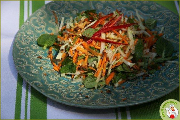 Если у вас завалялся кусочек отварной курицы, она отлично подойдет для приготовления этого салата. Зеленый лук можно заменить обычным репчатым, только сначала промаринуйте его в уксусе или лимонной кислоте (или обдайте кипятком).