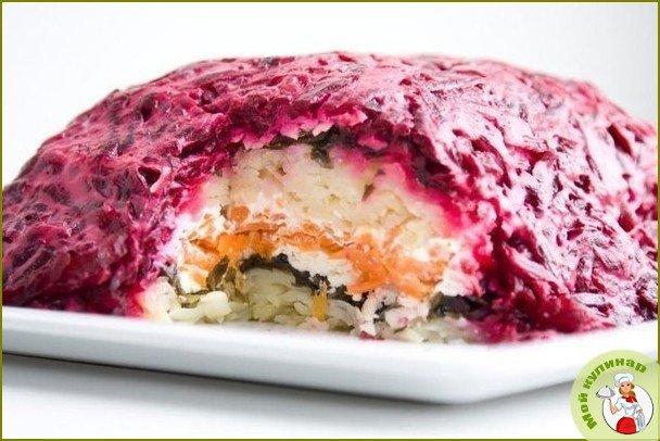 10. Очистите и измельчите свеклу. Вместе с майонезом и щепоткой соли распределите ровным слоем.