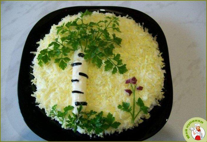 Хороший праздничный стол не обходится без вкусного и красивого салата. Именно таким является многослойный салат «Белая береза». Красивое оформление и насыщенный вкус — главные составляющие закуски!