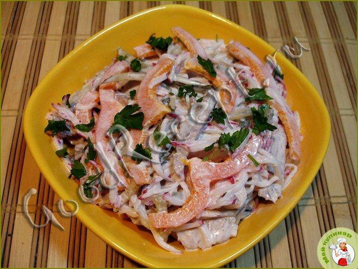 Вкусный и простой в приготовлении салат к обеду или ужину! Выручит вас, если вот-вот должны нагрянуть гости. Также, можно разнообразить праздничный стол, времени на приготовление нужно совсем немного.