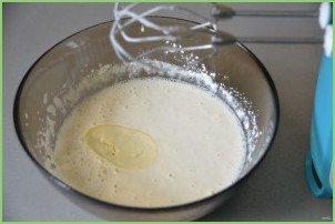 Взбейте тесто для блинчиков миксером до однородности, влейте 2,5 ст. ложки растительного масла. Оставшимся маслом смажьте сковороду, разогрейте и жарьте блинчики с двух сторон.
