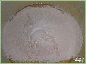Смешиваем яйца с растопленным маслом, добавляем немного муки и соду, гашеную уксусом.