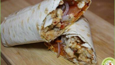 Точно так же поступаем с третьей и четвертой лепешкой. Растягиваем, смазываем растительным маслом, сворачиваем конвертом, выкладываем на вторую лепешку. Затем — фарш, сыр и дальше последняя третья лепешка, фарш , сыр. Затем поднимаем края первой лепешки и красиво заворачиваем наш пирог.