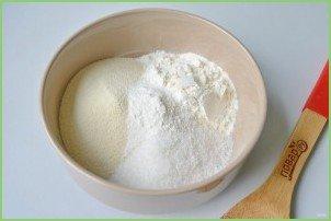 2. Смешайте сухие ингредиенты для пирога: манка, мука, сахар, разрыхлитель. На это у меня ушла 1 минута.