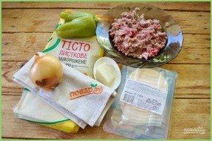 Для приготовления пирога нам нужно взять слоеное тесто, фарш мясной, лук репчатый, болгарский перец, специи к мясу на ваш выбор, сыр по типу моцареллы или твердый сыр, сливочное и растительное масло.