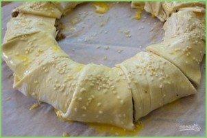 Заверните уголки теста внутрь, закрыв начинку. Хорошо защипните. Смажьте верхнюю часть теста взбитым яйцом. Посыпьте кунжутом для красоты (можно кунжут пропустить).