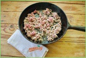 Лучше брать домашний фарш, приготовленный вами дома. Фарш не обязательно измельчать на мясорубке. Можно просто нарезать мясо ножом так, как вы это делаете для рубленых котлет. На растительном масле обжарьте фарш до готовности. Слегка посолите его и поперчите по вкусу. Я использую простые специи, но вы вольны взять любые на свой вкус.