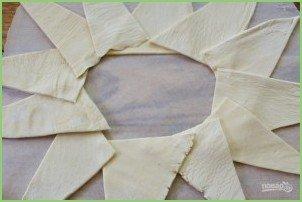 Раскатанное тесто нарежьте на треугольники. По кругу выложите их на пергаменте. Так будет удобнее сформированный пирог и перенести на противень. Итак, тесто выложили.