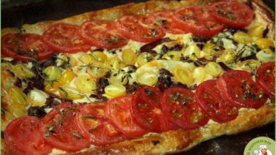 4. Теперь самый ответственный момент: раскатайте тесто, выложите на него помидоры и сверху начинку. Тесто также делайте потолще, чтобы помидоры не порвали его.