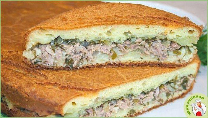 Вкусный и сытный пирог из рыбы и картофеля на заливном тесте. Пирог подойдет к чашечке чая или в качестве дополнения к горячим первым блюдам.