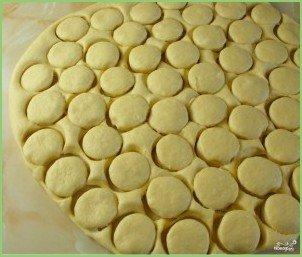 Пока мы готовили крем, тесто уже подошло. Раскатываем его в один слой толщиной в сантиметр. Берем рюмку или небольшой стакан и вырезаем кружки в тесте. Получаются такие вот приплюснутые шарики. Из остатков теста катаем шар и раскатываем его. Доделываем кружочки на остатках теста.