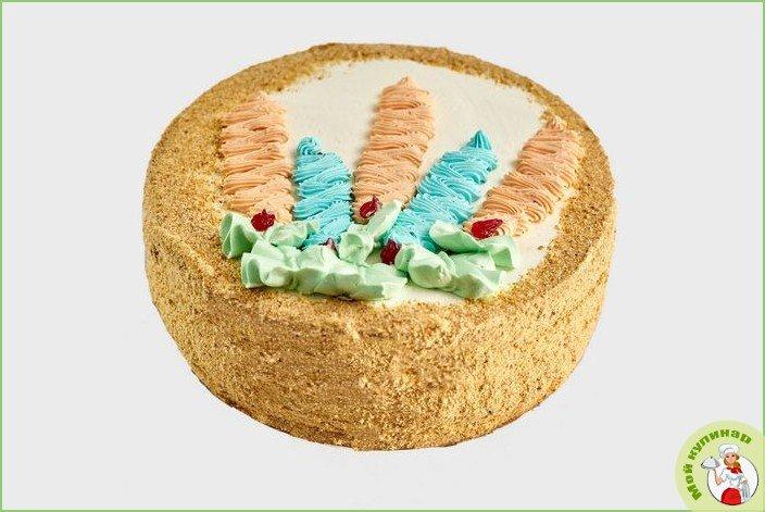 Придаем торту ровную прямоугольную форму, обрезая края. Края измельчаем в крошку, посыпаем ими наше пирожное. Красивое пирожное ставим в холодильник на пару часов, а лучше — на ночь, после чего оно будет готово к употреблению.